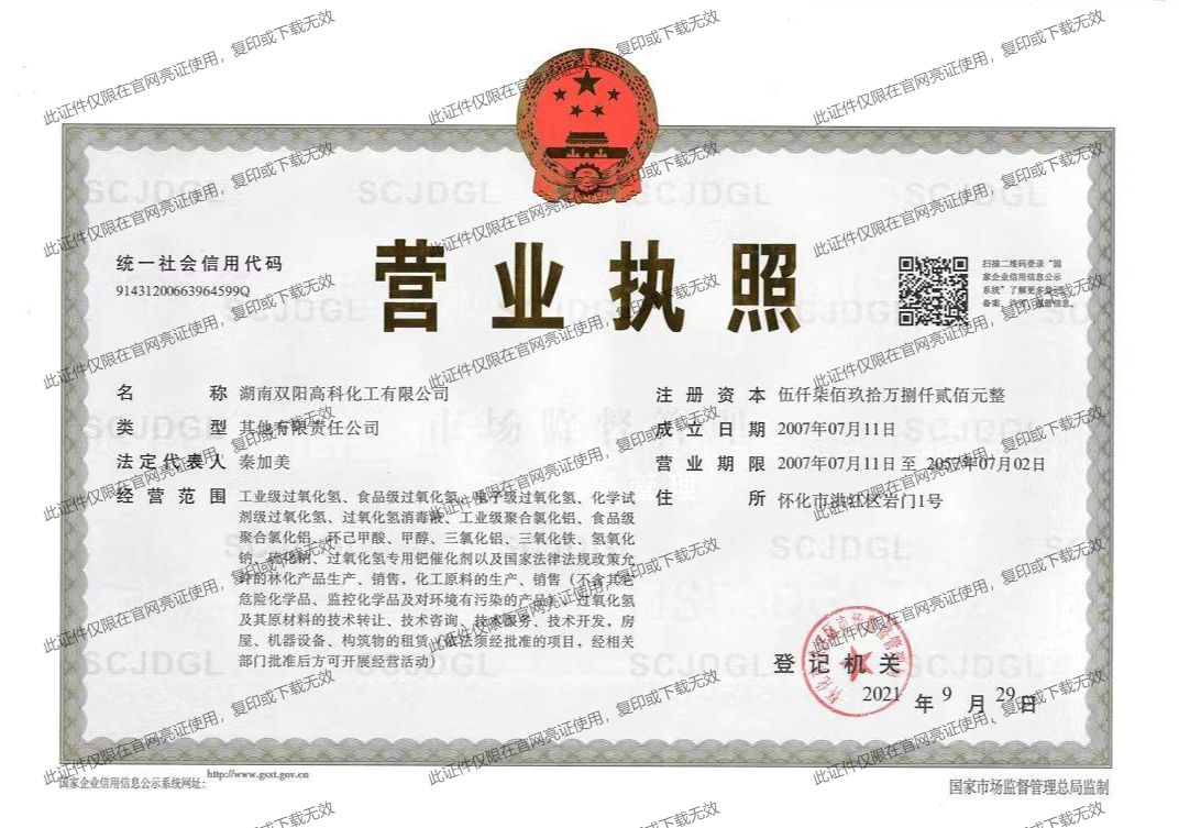 雙陽高科主要產(chǎn)品有工業(yè)級(jí)雙氧水、食品級(jí)雙氧水、電子級(jí)雙氧水、化學(xué)試劑級(jí)雙氧水、雙氧水消毒液、工業(yè)級(jí)聚合氯化鋁、食品級(jí)聚合氯化鋁、純度為99.5%的環(huán)己甲酸等產(chǎn)品,年產(chǎn)值過2億元,目前,公司產(chǎn)品內(nèi)銷全國(guó)各地,外銷東南亞等國(guó)家和地區(qū),擁有廣闊的國(guó)內(nèi)與國(guó)際市場(chǎng)。